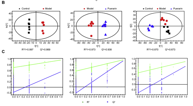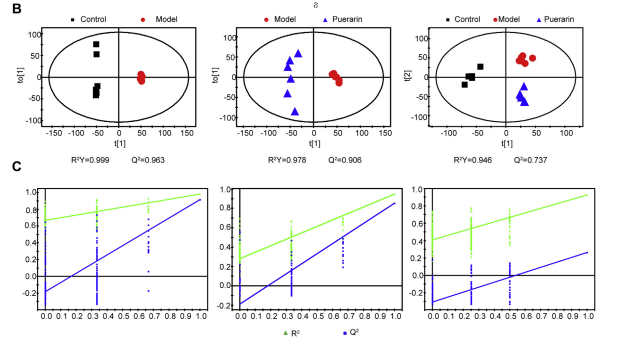 圖3A和圖4a顯示了小鼠肝臟組織和尿液的代表性1H NMR譜圖。為了研究NASH對小鼠代謝紊亂的影響,基于小鼠肝組織和尿液樣本的歸一化核磁共振波譜數據,計算PCA和OPLS-DA模型,揭示葛根素的干預作用。觀(guān)察到對照組和模型組之間肝臟和尿代謝表型的清晰分離(圖3B, 4b和S1),表明MCD飲食誘導小鼠NASH后發(fā)生了一些顯著(zhù)的生化變化。此外,PCA 和 OPLS-DA 得分圖揭示肝臟和泌尿代謝的完全分化模型和葛根素組之間的概況以及顯示葛根素組有恢復到健康對照組的趨勢,這可能歸因于葛根素對NASH的治療效果。兩個(gè)模型參數R2Y 和 Q2 以及置換測試的結果說(shuō)明了OPLS-DA 模型的有效性(圖 3C 和 4C)。