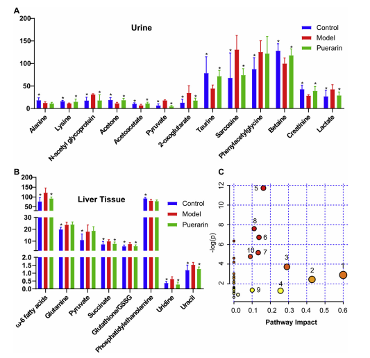 基于來(lái)自 OPLS-DA 模型的 VIP 值(VIP ≥ 1)和來(lái)自單變量統計分析的 P 值 (P < 0.05),8 和 13顯著(zhù)改變與 NASH 相關(guān)的內源性代謝物是分別被鑒定為肝組織和尿液中的潛在生物標志物(圖 5A 和 B,以及表 1)。肝臟代謝特征NASH 模型小鼠的 w-6 脂肪酸水平升高,谷氨酰胺、丙酮酸、琥珀酸、谷胱甘肽/GSSG、尿苷和尿嘧啶,連同的磷脂酰乙醇胺水平降低。關(guān)于健康控制與對照組相比,模型組尿中n -乙酰糖蛋白(NAG)、丙酮酸、2-氧戊二酸、肌氨酸、苯乙酰甘氨酸、乳酸水平升高,丙氨酸、賴(lài)氨酸、丙酮、乙酰乙酸、?;撬?、甜菜堿、肌酐水平降低。此外,除了肝臟組織中的谷氨酰胺、丙酮酸和磷脂酰乙醇胺(PE)以及尿液中的丙氨酸和苯乙酰甘氨酸外,所有與NASH相關(guān)的潛在生物標志物均被葛根素顯著(zhù)逆轉。