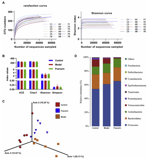 廣州中醫藥大學(xué)藥學(xué)院、 廣東藥科大學(xué)中醫學(xué)院、中山大學(xué)附屬第六醫院聯(lián)合在Journal of Pharmaceutical and Biomedical Analysis雜志發(fā)表以“Therapeutic potential of puerarin against methionine-choline-defificient diet-induced non-alcoholic steatohepatitis determined by combination of 1H NMR spectroscopy-based metabonomics and 16S rRNA gene sequencing”為題的文章,揭示葛根素對非酒精性脂肪性肝炎的治療方向的相關(guān)研發(fā)現,從而為非酒精性脂肪性肝病的治療提出新的見(jiàn)解理論基礎。其中微生物多樣性檢測由百邁客協(xié)助完成。