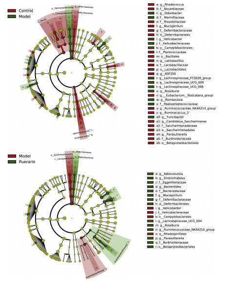 門(mén)水平的分類(lèi)分析表明,厚壁菌門(mén)、擬桿菌門(mén)和放線(xiàn)菌門(mén)在所有類(lèi)群的糞便微生物群落中占優(yōu)勢。與對照組相比,模型組的Epsilonbacteraeota水平較高,而葛根素處理可逆轉這一趨勢(圖7D)。采用LEfSe方法,篩選出LDA評分大于2.0的明顯改變的類(lèi)群,以鑒定類(lèi)群間(門(mén)到屬)的差異類(lèi)群。如圖8和圖9所示,在對照組和模型組之間,模型和葛根素組之間,共發(fā)現了40和24個(gè)不同的細菌分類(lèi)分支。有趣的是,在葛根素治療后,14種不同的細菌類(lèi)群在NASH小鼠中顯示出相同的恢復正常水平的趨勢,包括p Epsilonbacteraeota, c Campylobacteria、o彎曲菌目、 f 螺桿菌科、 g幽門(mén)螺桿菌屬、p 脫鐵桿菌門(mén)、c 脫鐵桿菌、 o 脫鐵桿菌、 f 脫鐵桿菌科、g Mucispirillum、o Betaproteobacteriales、f burkholderaceae、g Parasutterella 和g瘤胃球菌科NK4A214組。值得一提的是,模型小鼠中氏菌屬的成員比對照組小鼠大,葛根素治療后進(jìn)一步擴大。(字母 p、c、o、f 和 g 分別代表門(mén)、綱、目、科和屬)