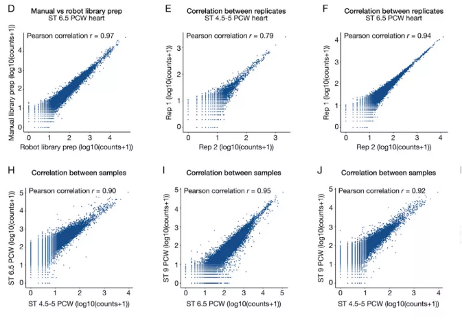 對同一樣本的 scRNA-seq 的基因表達數據與空間轉錄組的基因表達數據或者同一樣本的不同切片數據進(jìn)行 Pearson 相關(guān)性分析,從而評估技術(shù)重復之間的相似性[1]。