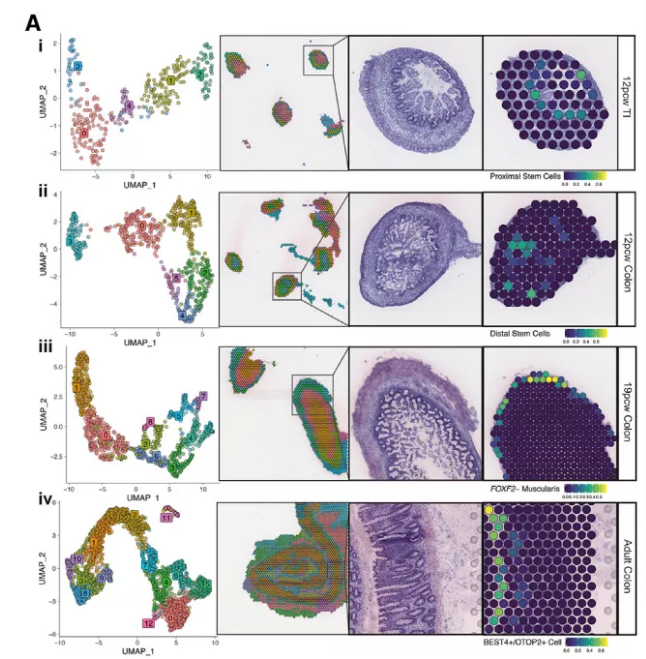 注:左側圖為ST的各個(gè)簇(cluster)的UMAP展示;左側中間圖為 clusters 在空間組織上的聚類(lèi)可視化展示;右側圖為 ST 與 scRNA-Seq 細胞類(lèi)型注釋結果的整合