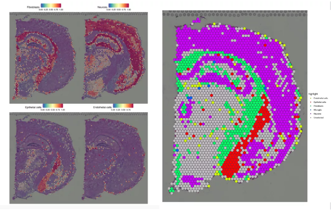 注:左圖展示單獨各個(gè)細胞類(lèi)群在空間的分布情況,右圖為空間組織切片每個(gè)spot的細胞類(lèi)型展示圖,不同顏色表示不同的細胞類(lèi)型