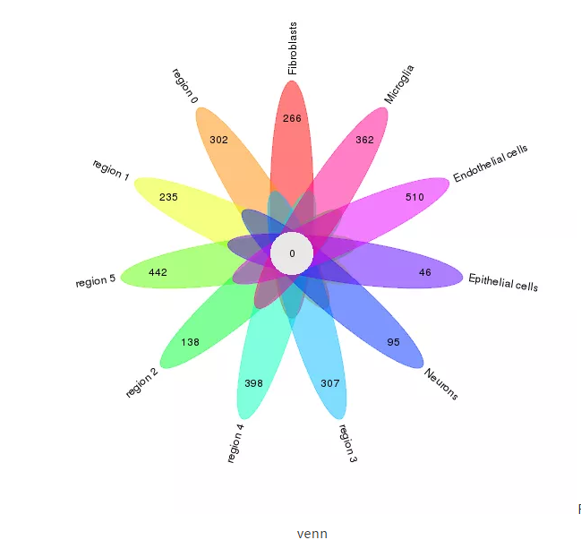 注:每個(gè)花瓣上的數字表示該細胞亞群或組織區域的差異基因總數,中間圓心的數字表示所有細胞亞群與組織區域的交集基因數