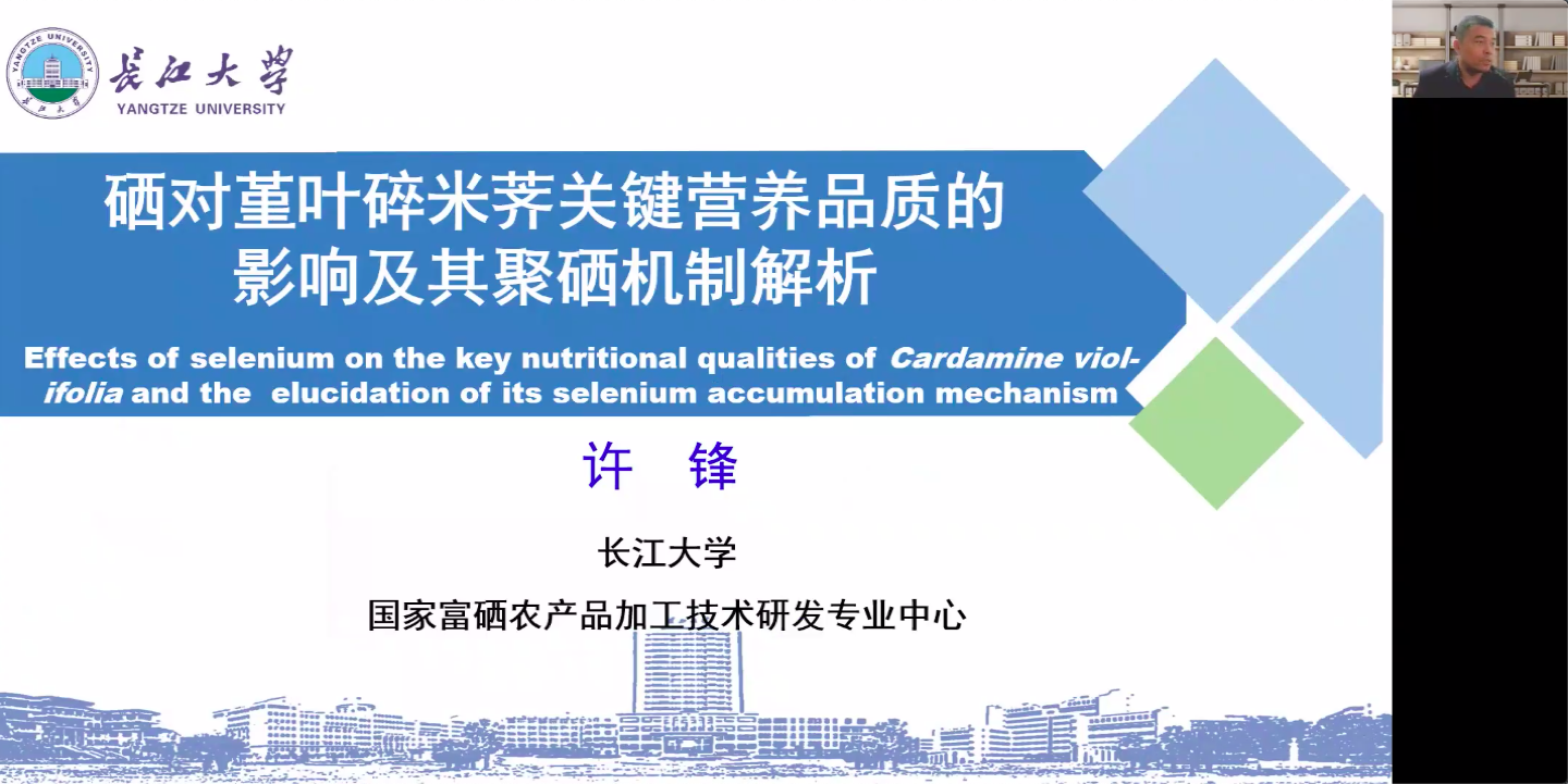 長(cháng)江大學(xué)許鋒教授首先報告了外源硒處理下,堇葉碎米薺在幼苗期和成熟期都積累高含量的硒;然后講解了不同濃度的硒處理下,通過(guò)轉錄組、蛋白組和代謝組解析堇葉碎米薺的分子機制的研究工作,認為相關(guān)基因的表達變化減少了硫元素消耗,優(yōu)化了硫元素利用,可能是堇葉碎米薺耐硒的重要原因。