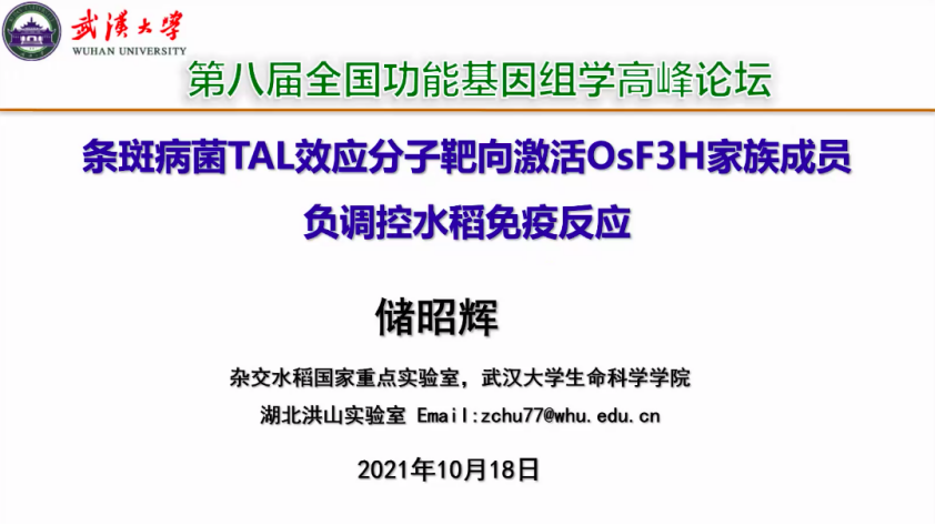 武漢大學(xué)生命科學(xué)學(xué)院儲昭輝教授報告了其團隊在水稻和條斑病菌互作上的研究進(jìn)展,講解了HGA4菌株致病力更強的原因是其比RS105菌株包含更多TAL效應因子,并且表明Tal2b、Tal2c是兩個(gè)致病因子,它們通過(guò)分別靶向調控水稻中OsF3H03g、OsF3H04g基因進(jìn)而調控水稻對條斑病的抗性,最后展示了對其進(jìn)行的一系列功能驗證與分子機制研究。