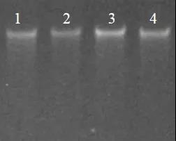 圖1:DNA的凝膠電泳圖。將提取的DNA進(jìn)行1.2%瓊脂糖凝膠電泳跑膠。Lane1:牛血;Lane 2:羊血;Lane 3:松毛蟲(chóng)赤眼蜂;Lane 4:Hela細胞。