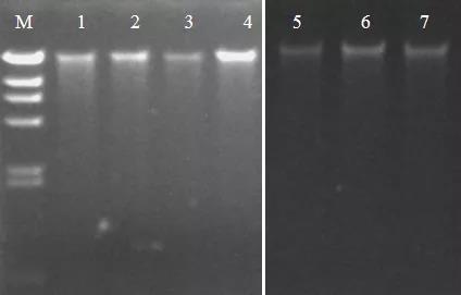 圖3:DNA的凝膠電泳圖。將提取的DNA進(jìn)行1%瓊脂糖凝膠電泳跑膠。其中M: λ-Hind Ⅲ DNA Marker;Lane 1:芝麻/種子 ;Lane 2:堇菜/葉片;Lane 3:水稻/種子;Lane 4:油莎豆/葉片;Lane 5:馬鈴薯/塊莖;Lane 6:沙棘/果實(shí) ;Lane 7:煙草/葉片 。