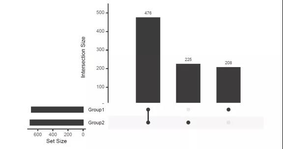 圖1. upset示例,展示Group1/Group2兩組組間共有和特有元素的數量