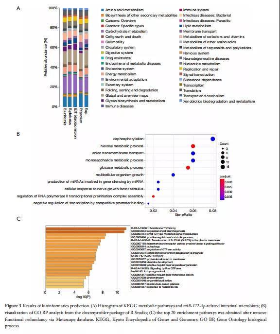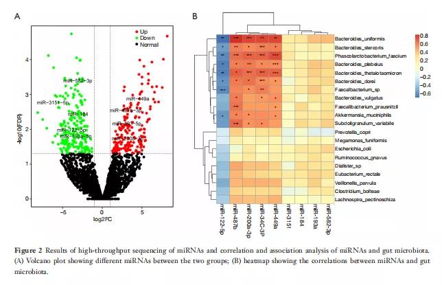通過(guò)行Spearman相關(guān)分析。圖2B顯示了一個(gè)熱圖,描繪了五個(gè)與某些微生物區系具有統計顯著(zhù)正相關(guān)和負相關(guān)的miRNA(P<0.05)。在這五種miRNA中,miR-122-5p在哺乳動(dòng)物的進(jìn)化過(guò)程中高度保守,與八種腸道細菌相關(guān),包括兩種腸道細菌B.uniformis和P.faecium,它們有顯著(zhù)差異(分別為P=0.023和0.031)。