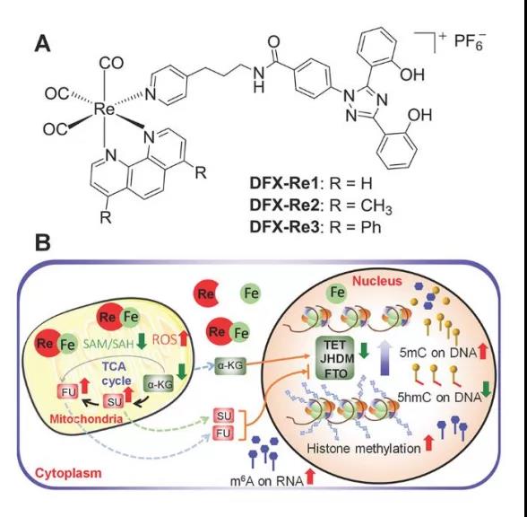 文章設計了三個(gè)線(xiàn)粒體靶向錸(I)配合物,其中加入了一種臨床鐵螯合劑脫鐵石(DFX),以同時(shí)干擾線(xiàn)粒體代謝和鐵穩態(tài)。其中,DFX-Re3可以將細胞鐵遷移到線(xiàn)粒體,干擾線(xiàn)粒體代謝,包括與表觀(guān)遺傳修飾相關(guān)的關(guān)鍵代謝物。