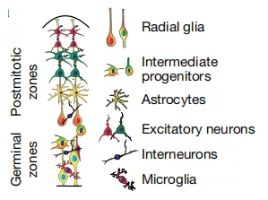 圖1:發(fā)育中皮質(zhì)的橫截面示意圖,顯示了主要細胞類(lèi)型。