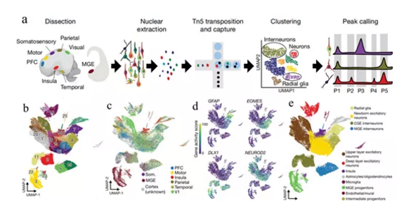 染色質(zhì)狀態(tài)通過(guò)調節基因調控元件(如增強子)的可及性來(lái)確定基因組的功能結構,這些元件是轉錄調節因子的結合位點(diǎn)。在發(fā)育過(guò)程中,轉錄因子的順序級聯(lián)逐漸重塑,并且不同細胞類(lèi)型呈現出染色質(zhì)可及性的差異化。盡管染色質(zhì)的可及性是細胞特性的一個(gè)基本特征,但關(guān)于大腦發(fā)育過(guò)程中染色質(zhì)狀態(tài)變化的研究相對較少。目前單細胞基因組學(xué)已經(jīng)能夠使用scATAC-seq以細胞分辨率對染色質(zhì)狀態(tài)進(jìn)行可伸縮分析。在發(fā)育中的小鼠大腦中,scATAC-seq揭示了作為神經(jīng)發(fā)育過(guò)程基礎的染色質(zhì)可及性的高度動(dòng)態(tài)變化。有必要將這些研究擴展到人類(lèi)初級組織,以便更好地了解非編碼調控元件(包括人類(lèi)特有的神經(jīng)發(fā)育增強子)的突變如何干擾正常的發(fā)育過(guò)程,并導致精神神經(jīng)發(fā)育障礙的遺傳基礎。