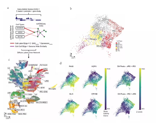 使用基因活性分數來(lái)區分細胞類(lèi)型,鑒定了多種主要的細胞類(lèi)型,包括放射狀膠質(zhì)細胞(RGS)、中間前體細胞(IPC)、深層(皮質(zhì)V-VI層)興奮性神經(jīng)元(dlENs)、上層(皮質(zhì)II-IV層)興奮性神經(jīng)元(UlENs)、MGE和CGE來(lái)源的皮質(zhì)中間神經(jīng)元(分別為IN-MGES和IN-CGES)、胰島神經(jīng)元、MGE的前體細胞、小神經(jīng)膠質(zhì)細胞、少突膠質(zhì)前體細胞(OPCs)、內皮細胞以及壁細胞。此外,結合scRNA-seq數據,使用CellWalker將scATAC-seq細胞與細胞類(lèi)型匹配。CellWalker以更精細的分辨率識別細胞類(lèi)型和更廣泛的細胞亞型。此外,作者可以在兩種亞型(TRGS和ORGS)之間識別出不同的開(kāi)放區,這兩種亞型分別表達CRYAB和HOPX,這表明scATAC-seq能夠在高分辨率下區分細胞亞型,具有更高的靈敏度。