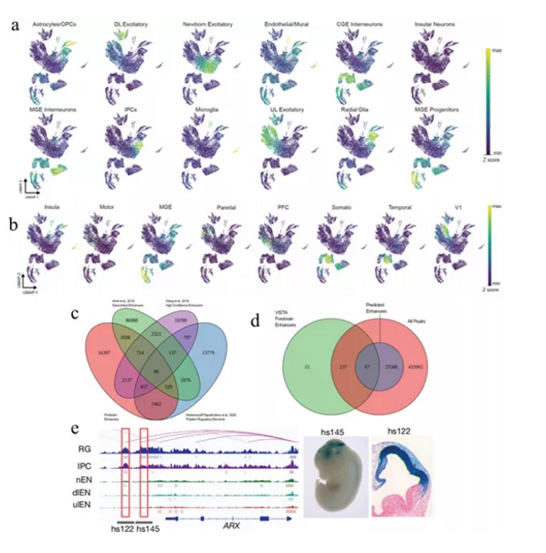 為了鑒定候選增強子,整合了ATAC-seq、CUT&Tag、Hic和基因表達數據,并使用接觸活性算法來(lái)預測所有類(lèi)型的皮質(zhì)細胞的增強子-基因相互作用。共預測了25,659個(gè)基因連鎖增強子。其中在發(fā)育中的人皮層分離的細胞上進(jìn)行了染色質(zhì)免疫沉淀和測序(PLAC-seq),發(fā)現了67,493個(gè)開(kāi)放區以及10,050個(gè)預測的增強子,這些開(kāi)放區和預測的增強子與預測的細胞類(lèi)型特異性增強子相關(guān)的基因被富集。為了進(jìn)一步驗證注釋的z確性,將開(kāi)放區與從人類(lèi)皮質(zhì)組織樣本生成的公開(kāi)可用數據進(jìn)行關(guān)聯(lián)分析。發(fā)現scATAC-seq鑒定到了混合測序數據注釋的大多數開(kāi)放區,并且還鑒定了許多在混合數據中未預測的細胞類(lèi)型特異性peaks,特別是富集在諸如小神經(jīng)膠質(zhì)細胞和內皮細胞的稀有細胞群體中的開(kāi)放區。在功能驗證的前腦增強子中,大多數(319個(gè)中的304個(gè))與染色質(zhì)可及性開(kāi)放區重疊,但只有67個(gè)重疊的增強子是通過(guò)激活接觸方法進(jìn)行預測??傊?,這些分析表明,scATAC-seq是一種從異質(zhì)組織樣本中檢測染色質(zhì)可及性模式的可靠方法。然而,預測的增強子與以前發(fā)表的研究的有限重疊表明,迫切需要更好地理解預測調控潛力的計算機算法的相關(guān)特征。