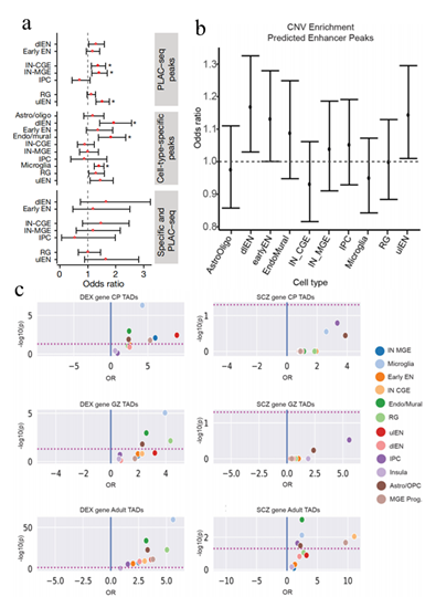 不同發(fā)育階段和分化狀態(tài)的染色質(zhì)狀態(tài)的細胞分辨率數據可能提供突變和發(fā)育中的不同細胞類(lèi)型選擇性脆弱性之間的聯(lián)系。為此,研究者將特定細胞類(lèi)型的ATAC-seq peaks和預測的增強子與疾病相關(guān)的常見(jiàn)和罕見(jiàn)的非編碼突變體記性關(guān)聯(lián)分析。首先分析了細胞類(lèi)型特異性的peaks sets、預測的增強子、啟動(dòng)子相互作用區域與基因組區域重疊的peaks值,這些區域在發(fā)育遲緩的個(gè)體中富集了拷貝數變異;結果發(fā)現dlEN、內皮/壁層和小神經(jīng)膠質(zhì)細胞特異性peaks顯著(zhù)富集,以及中間神經(jīng)元中重疊啟動(dòng)子相互作用區的peaks顯著(zhù)富集。