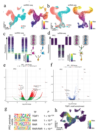 在神經(jīng)發(fā)生的早期,出現了特定區域類(lèi)型的皮質(zhì)興奮性神經(jīng)元,但在不同區域的前體細胞之間只發(fā)現了有限的轉錄差異。調控元件的可及性變化通常先于基因表達。研究者比較了頭-尾軸兩端、PFC和V1的興奮性譜系細胞的scRNA-seq和scATAC-seq圖譜。在每種模式中,對細胞進(jìn)行擬時(shí)間分析,確定分化軌跡,并沿著(zhù)該軌跡確定PFC和V1譜系之間轉錄或染色質(zhì)狀態(tài)差異變得明顯的“分支點(diǎn)”。與轉錄組數據揭示了興奮性神經(jīng)元的區域特異性分群不同的是,染色質(zhì)狀態(tài)特征表明PFC和V1中間前體細胞群體之間存在顯著(zhù)差異。在轉錄水平上,PFC和V1IPCs只有少數幾個(gè)基因有差異表達,而染色質(zhì)可及性分析發(fā)現這些細胞類(lèi)型之間有1800多個(gè)差異可及區。