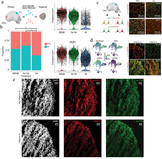 在哺乳動(dòng)物大腦發(fā)育的過(guò)程中,視黃酸信號在神經(jīng)組織中發(fā)揮著(zhù)重要的作用。為了測試RA是否促進(jìn)人類(lèi)PFC的分化,在含有或不含有維生素A(RA合成的前體)的情況下培養皮質(zhì)類(lèi)器官。同時(shí)利用DEAB(一種有效的RA合成抑制劑)處理與維生素A一起培養的腦類(lèi)器官。在分化的第10周,此時(shí)深層神經(jīng)正在發(fā)生,利用scRNA-seq分析了腦類(lèi)器官。發(fā)現在維生素A存在下培養的興奮性前腦神經(jīng)元與不含維生素A或在DEAB存在下培養的腦類(lèi)器官的神經(jīng)元是分開(kāi)聚類(lèi)的。還發(fā)現了區分PFC和V1皮層神經(jīng)元的信號。利用目前的分類(lèi)方法注釋類(lèi)器官神經(jīng)元中的PFC和V1神經(jīng)元的特征;與未使用維生素A培養或使用DEAB處理的神經(jīng)元相比,維生素A培養的類(lèi)器官中PFC類(lèi)似神經(jīng)元的比例始終較高。免疫染色證實(shí)了基因產(chǎn)物的差異表達,并發(fā)現與含有維生素A培養的腦類(lèi)器官的PFC特性一致。這些發(fā)現表明,RA信號通路有助于人類(lèi)皮質(zhì)發(fā)育過(guò)程中PFC神經(jīng)元譜系的發(fā)育。