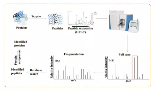 蛋白質(zhì)質(zhì)譜鑒定的基本原理是用蛋白酶將蛋白質(zhì)消化成肽段混合物,經(jīng)MAILDI或ESI等軟電離手段將其離子化,然后通過(guò)質(zhì)量分析器將具有特定質(zhì)核比的肽段離子分離開(kāi)來(lái)。通過(guò)實(shí)際譜圖和理論上蛋白質(zhì)經(jīng)過(guò)蛋白酶消化后產(chǎn)生的一級質(zhì)譜峰圖和二級質(zhì)譜峰圖進(jìn)行的比對,進(jìn)行蛋白鑒定。