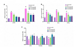 首先,作者分析了α-SMA和Collagen I的mRNA表達情況。如圖10A所示,與溶劑對照組相比CCl4組α-SMA和Collagen I表達顯著(zhù)升高。隨后研究了IL-1β、IL-6和TNF-α 三種炎癥因子mRNA表達情況。如圖10B所示,與溶劑對照組相比CCl4組肝臟IL-1β、IL-6和TNF-α mRNA表達水平升高。