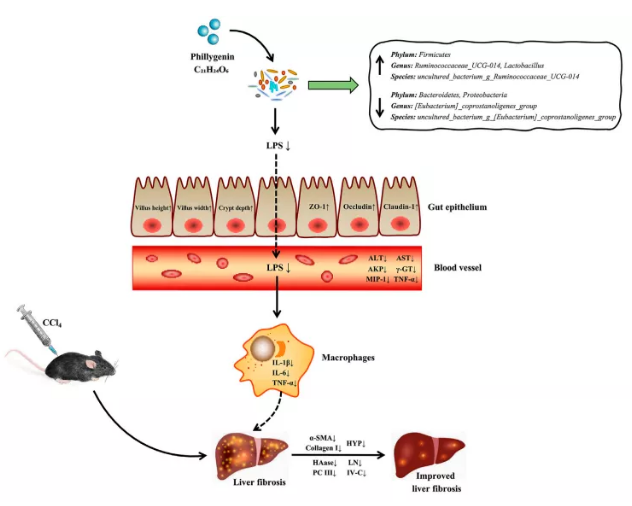連翹素(PHI)具有良好的保肝作用,通過(guò)TLR4/MyD88/NF-κB信號通路抑制脂多糖誘導的促炎反應和LX2細胞的激活,從而緩解肝纖維化。此外,鑒于腸道菌群在肝纖維化發(fā)展過(guò)程中的重要作用,PHI的抗纖維化作用是否部分依賴(lài)于腸道菌群失調的調節尚不清楚。