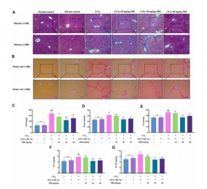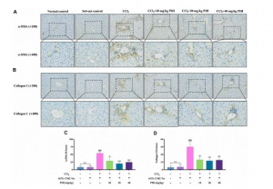 觀(guān)察纖維組織分布、Masson染色及Sirius red染色。如圖3A和B所示,Masson染色時(shí)膠原纖維呈藍色,Sirius red染色時(shí)呈紅色。結果表明,正常對照組和溶劑對照組幾乎不產(chǎn)生膠原纖維,而CCl4可誘導產(chǎn)生大量的膠原纖維。有趣的是,PHI處理顯著(zhù)減少了肝臟中膠原的積累。