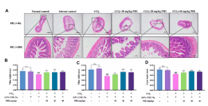 此外,作者測量了各組小鼠回腸絨毛高度、寬度和隱窩深度,結果如圖6B-D所示。正常對照組與溶劑對照組無(wú)明顯差異。與溶劑對照組相比,CCl4組回腸絨毛高度、寬度和隱窩深度顯著(zhù)減少。PHI(20和40mg/kg)處理后上述指標減少均可逆轉。綜上所述PHI可以顯著(zhù)改善腸道損傷。