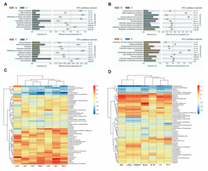 作者通過(guò)KEGG和COG數據庫預測了微生物的功能(圖9A和B)。CCl4處理組富集的通路為energy production and conversion、membrane transport和signal transduction mechanisms。肝纖維化小鼠PHI處理后,微生物富集的通路為carbohydrate transport and metabolism、lipid transport and