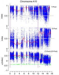 BSA(Bulked Segregant Analysis),又稱(chēng)集群分離分析法或混合分組分析法,針對目標性狀,選擇表型極端差異的親本構建家系,同時(shí)對兩親本和該家系目標性狀表型極端的子代分別混合得到的兩個(gè)混池進(jìn)行全基因組重測序,檢測到的兩混池間DNA差異片段即為候選區域,并注釋該區域基因,可進(jìn)一步定位到目標性狀相關(guān)的基因或標記。利用該方法,可以快速的對單一性狀在基因組上進(jìn)行定位。