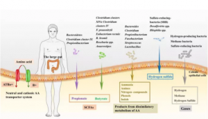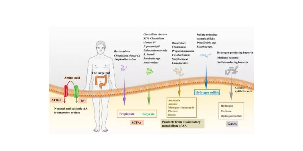 氨基酸(Amino Acids,AAs)是人體必需的物質(zhì),它不僅是蛋白質(zhì)合成的原材料,還可以參與微生物代謝。人體獲取氨基酸不僅可以通過(guò)腸道吸收,還可以由微生物代謝產(chǎn)生。不僅如此,氨基酸組成和豐度的變化可影響代謝細菌群落,并通過(guò)TLR受體、NLR受體等調節巨噬細胞和樹(shù)突狀細胞,還可通過(guò)AhR受體、5-HT調節腸道微生物免疫軸,以及其他信號通路,所有這些通路在直接或間接調節腸粘膜免疫和微生物群方面起著(zhù)關(guān)鍵作用,有助于腸道內環(huán)境平衡。[1]