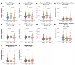 ③實(shí)驗結論:與HC患者相比,PSC的微生物較少,并且維生素B6合成相關(guān)基因和支鏈氨基酸(BCAAs)合成相關(guān)基因豐度差異顯著(zhù),代謝組檢測到PSC中維生素B6和BCAAs濃度降低,這與肝移植生存率降低密切相關(guān),這表明研究微生物代謝物可能有助于查明與 PSC病程相關(guān)的生物學(xué)變化。
