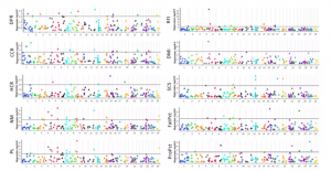 在牛的CNV變異研究中,利用已發(fā)表的1,116個(gè)牛中的鑒定的25,030個(gè)CNVs,基于不同性狀(功能、健康、繁殖等)的CNVs進(jìn)行GWAS,并評估其對養殖和育種實(shí)踐的影響,結果顯示,共有56個(gè)CNVs與8個(gè)表型性狀中的一個(gè)或多個(gè)顯著(zhù)相關(guān),其中12號染色體上的3個(gè)CNVs與產(chǎn)脂性狀和乳腺性狀的顯著(zhù)關(guān)聯(lián),這些CNVs位于23個(gè)不同的基因上,該研究是首次對如此大的瑞士奶牛樣本進(jìn)行基因組分析,將CNVs與繁殖、乳腺和健康性狀聯(lián)系起來(lái)。同樣,基于在528個(gè)荷斯坦奶牛中鑒定的197個(gè)CNVs(圖4),對473頭牛10個(gè)重要生產(chǎn)性狀進(jìn)行GWAS分析,共檢測到57個(gè)CNVs與至少一個(gè)性狀顯著(zhù)相關(guān)(圖5),對這些CNVs與候選基因的潛在重疊進(jìn)行分析,預測得到一些表型相關(guān)的候選基因,該研究結果對荷斯坦奶牛的基因組鑒定了CNV,并提供了影響飼料效率和采食相關(guān)性狀變異的候選基因。
