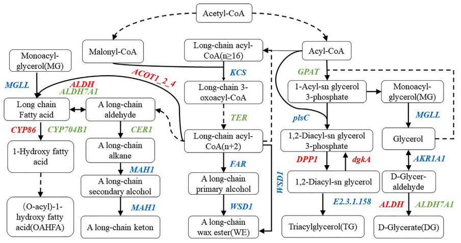 在OAHFA合成過(guò)程中,?;o酶A硫代酯酶1/2/4基因(ACOT1_2_4)的上調表達促進(jìn)長(cháng)鏈脂肪酸的合成,而?;视椭久富颍∕GLL)的表達水平在單?;视娃D化為長(cháng)鏈脂肪酸的過(guò)程中上調和下調。醛脫氫酶家族7個(gè)成員A1基因(ALDH7A1)表達下調抑制了A長(cháng)鏈醛與長(cháng)鏈脂肪酸之間的過(guò)渡,醛脫氫酶基因(ALDH)則上調了A長(cháng)鏈醛與長(cháng)鏈脂肪酸之間的過(guò)渡。在長(cháng)鏈脂肪酸轉化為ω-羥基脂肪酸的過(guò)程中,長(cháng)鏈脂肪酸ω-單加氧酶基因(CYP704B1)的表達下調,而突變無(wú)蠟脂肪酸ω-羥化酶基因(CYP86)的表達上調。甘油-3磷酸?;D移酶基因(GPAT)和ALDH7A1在DG、MG和TG的甘油酯代謝過(guò)程中下調。在無(wú)蠟情況下,葡萄糖的表達下調抑制了1-?;?sn甘油3-磷酸的合成,從而減少了鎂的合成。ALDH7A1在低蠟突變體中的下調表達降低了DG的合成。上調基因為ALDH、二酰甘油二磷酸磷酸酶基因(DPP1)和二酰甘油激酶基因(dgkA),而1-?;?SN-甘油-3-磷酸?;D移酶基因(plsC)的表達為磷脂:酰甘油?;D移酶基因(E2.3.1.158)、MGLL和酒精脫氫酶基因(AKR1AI)均上調和下調。這些基因共同作用降低低蠟突變無(wú)蠟細胞中TG的含量。