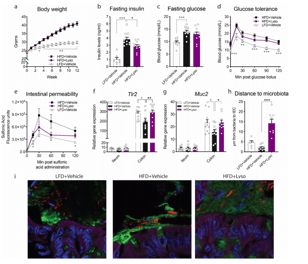 該文章首先研究了溶菌酶對飲食誘導型肥胖小鼠的潛在影響。研究結果發(fā)現,與喂食LFD的小鼠相比,喂食HFD的小鼠體重增加了更多,每天補充溶菌酶對身體成分或能量攝入沒(méi)有產(chǎn)生可測量的影響(圖1a),然而,接受溶菌酶治療的小鼠確實(shí)表現出了更低的空腹胰島素水平(圖1b)。與Vehicle+HFD組相比,溶菌酶更傾向于降低餐后血糖而不是空腹血糖。葡萄糖刺激的胰島素濃度不受溶菌酶補充的影響。與已知可以調節腸道滲漏的空腹胰島素減少類(lèi)似,本文研究者們在溶菌酶灌胃的動(dòng)物中觀(guān)察到HFD誘導的腸道通透性出現數值保護(圖1e)。這些體內跡象表明HFD喂養的小鼠腸道通透性增加,且循環(huán)LPS、腸炎癥以及與結腸和回腸緊密連接基因的表達在組間保持相似。盡管如此,溶菌酶還是使HFD誘導的結腸中Tlr2表達的減少維持在正常范圍內(圖1f)。根據已有研究顯示,TLR2的激活與結腸杯狀細胞的黏液調節有關(guān),因此本文研究者們調查了黏液的產(chǎn)生,發(fā)現補充溶菌酶可防止HFD誘導的結腸Muc2下調(圖1g)。進(jìn)一步的,發(fā)現這種溶菌酶介導的黏液完整性保存,可能是由于腸上皮細胞到最近細菌的平均距離增加6倍以上導致,從而說(shuō)明補充溶菌酶足以防止HFD引起的微生物區系侵蝕(圖1h-i)。