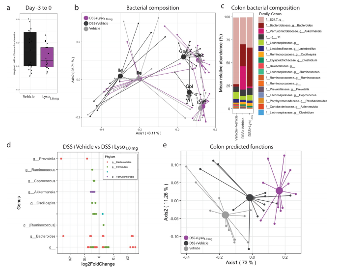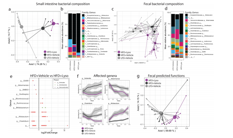 由于微生物區系侵蝕的減少也可能由于溶菌酶具有潛在的殺菌活性,因此本文研究者接下來(lái)評估了實(shí)驗小鼠糞便微生物群的縱向變化。在研究開(kāi)始時(shí),所有的小鼠都低脂喂養,且微生物組成分析顯示這些小鼠的微生物組成具有相似性。HFD喂養導致了小腸和糞便樣本中的微生物群組成產(chǎn)生了巨大差異(圖2a-d)??v向抽樣顯示,飲食干預導致糞便微生物群發(fā)生即時(shí)變化,而溶菌酶給藥的影響逐漸顯現。與其他組相比,每天接受口服溶菌酶的小鼠,其微生物群落在結構上表現出獨特和漸進(jìn)的軌跡(圖2c)。但盡管如此,除在小腸中,一些HFD誘導的糞便微生物變化可以通過(guò)補充溶菌酶來(lái)抵抗(圖2a-f)。微生物群的alpha多樣性不受溶菌酶給藥的影響,說(shuō)明該溶菌酶沒(méi)有相應明顯的抗菌作用。與vehicle組小鼠相比,接受溶菌酶的小鼠糞便中大量細菌ASVs的相對豐度被修飾了,且受調控的ASVs大多屬于厚壁菌門(mén),其中Akkermansia muciniphila和Oscillospira(顫螺菌屬)減少,胃瘤胃球菌屬的一種未分類(lèi)的胃瘤胃球菌、假長(cháng)雙歧桿菌和異歧桿菌的相對豐度則增加(圖2e)。此外,由于補充了溶菌酶,4個(gè)細菌屬顯示在整個(gè)屬水平都發(fā)生了ASVs豐度改變(圖2f),而其它的ASV修飾則呈現出物種依賴(lài)性。接下來(lái),本文研究者們對細菌群落進(jìn)行了功能預測,結果顯示接受溶菌酶的小鼠糞便樣本菌群預測功能發(fā)生了顯著(zhù)變化,而小腸樣本中則沒(méi)有顯著(zhù)變化(圖2g和圖3f)。