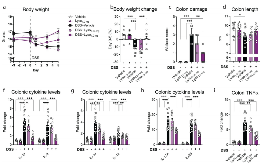 為了進(jìn)一步研究補充溶菌酶對腸道健康的有益效果,本文中研究者們評估了化學(xué)誘導(DSS誘導)的輕度結腸炎中的結腸損傷。設置了兩種劑量(1.0mg和0.4mg)的溶菌酶。在體重方面,發(fā)現接受1.0mg溶菌酶在對DSS誘導的小鼠的有一定的保護作用(圖3a-b),而0.04mg劑量的溶菌酶雖然缺乏保護作用,但是仍能抑制腸道炎癥(圖3c-h)。研究者還在所有測量數據中觀(guān)察到一個(gè)高度一致的劑量依賴(lài)性趨勢(圖3a-h)。與對照組小鼠相比,1.0mg溶菌酶沒(méi)有引起結腸損傷或細胞因子水平的可測量變化,因此表明溶菌酶不影響健康小鼠的免疫穩態(tài)(圖3c-h)。