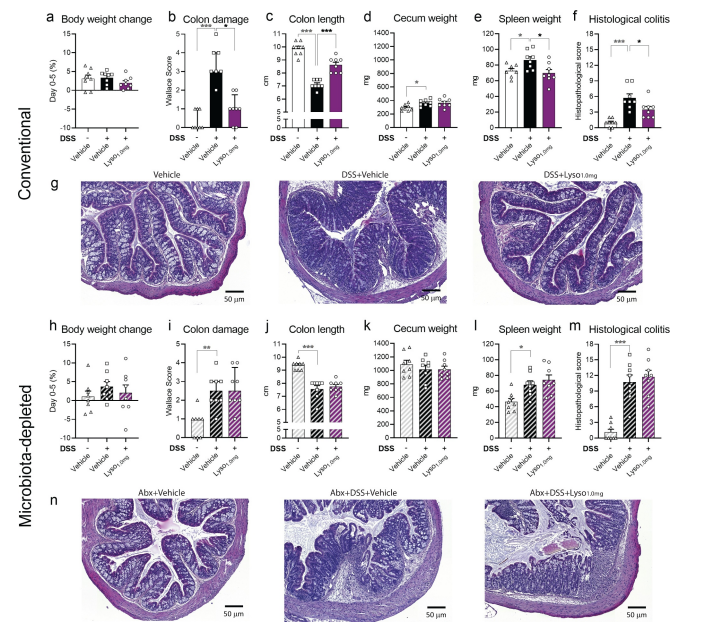 為了進(jìn)一步評估這種溶菌酶對腸道炎癥的療效,研究者接下來(lái)對DSS誘導的常規小鼠或微生物耗盡的BALB/c小鼠補充溶菌酶。