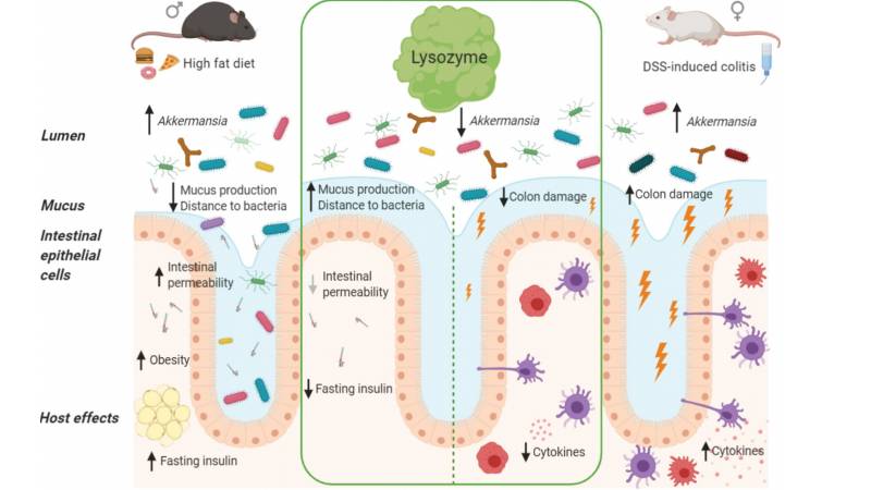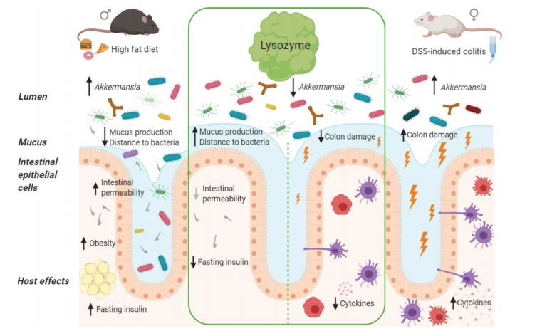 研究發(fā)現溶菌酶可劑量依賴(lài)性地減輕DSS刺激小鼠的腸道炎癥,可通過(guò)黏液的產(chǎn)生抑制HFD誘導的微生物群侵犯或易位,并可預防空腹高胰島素血癥。同時(shí)研究也發(fā)現溶菌酶保護腸道健康依賴(lài)于一些復雜的腸道菌群。