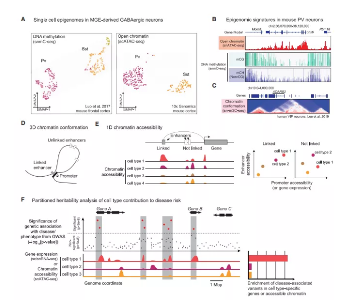 盡管全基因組關(guān)聯(lián)研究(GWASs)已經(jīng)確定了一些神經(jīng)和精神疾病的風(fēng)險位點(diǎn),但每種疾病中特定腦細胞類(lèi)型的脆弱性在很大程度上仍是未知的。通過(guò)細胞類(lèi)型特異性轉錄組或表觀(guān)基因組的遺傳分析可以識別活躍基因在GWAS風(fēng)險位點(diǎn)附近富集的細胞類(lèi)型,表明其在疾病中可能具有直接或間接的作用(圖3F)。