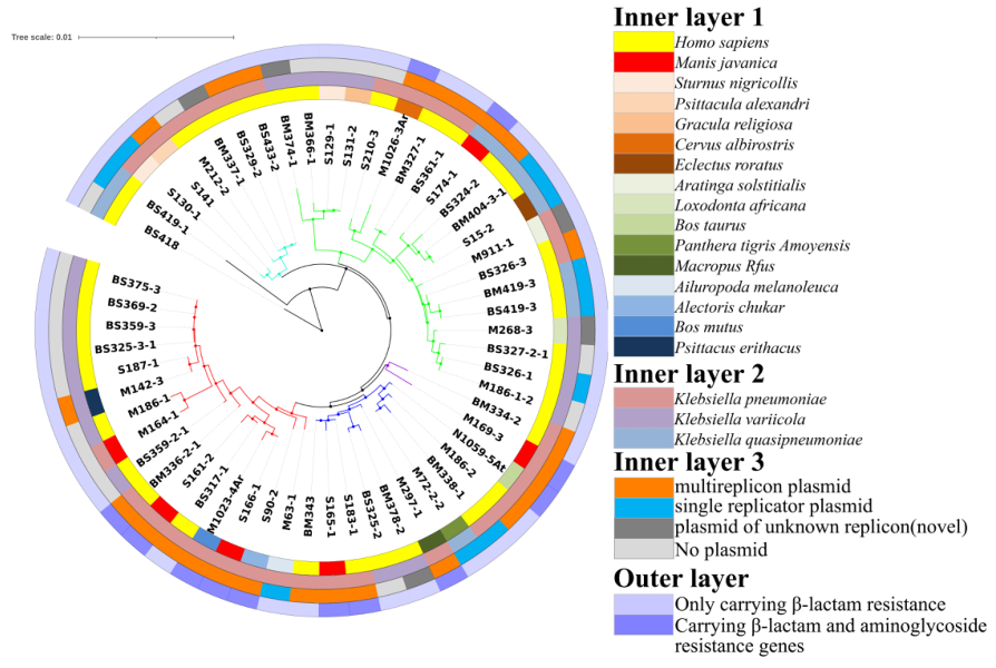 多復制子耐藥質(zhì)粒已成為革蘭氏陰性菌耐藥基因的重要載體,但多復制子質(zhì)粒的進(jìn)化尚不清楚。該研究采用微量肉湯稀釋法對2018年至2020年從不同野生動(dòng)物和環(huán)境中分離到的56株克雷伯氏菌進(jìn)行了表型鑒定,并對其進(jìn)行了測序和分析,以進(jìn)行細菌全基因組關(guān)聯(lián)研究。結果表明,非人類(lèi)來(lái)源的菌株對氨芐西林的耐藥率較高(80.36%),且耐藥范圍較廣。馬來(lái)亞穿山甲分離株對頭孢類(lèi)抗生素高度耐受,同時(shí)對氯霉素、左氧氟沙星和復方新諾明等藥物耐受?;蚪M分析表明,這些菌株的抗性質(zhì)粒攜帶多種抗生素耐藥基因。進(jìn)一步對69個(gè)質(zhì)粒序列分析表明,28個(gè)質(zhì)粒為多復制子質(zhì)粒,主要攜帶blaCTX-M-15、blaCTX-M-14、blaCTX-M-55、blaOXA-1和blaTEM-1等β-內酰胺酶基因。對不同分離株攜帶的質(zhì)粒分析表明,Klebsiella pneumoniae可能是一種重要的多復制子質(zhì)粒宿主。質(zhì)粒骨架和結構分析表明,多拷貝質(zhì)粒是由兩個(gè)或兩個(gè)以上的單個(gè)質(zhì)粒融合而成,對抗生素環(huán)境具有很強的適應性,不斷增強耐藥菌株在世界范圍內傳播的能力。綜上所述,多復制子質(zhì)粒比非復制子質(zhì)粒能夠更好地攜帶抗性基因,這可能是細菌對高抗生素壓力環(huán)境反應的重要機制。該研究對于未來(lái)探索細菌抗性基因的傳播擴散機制具有重要意義。