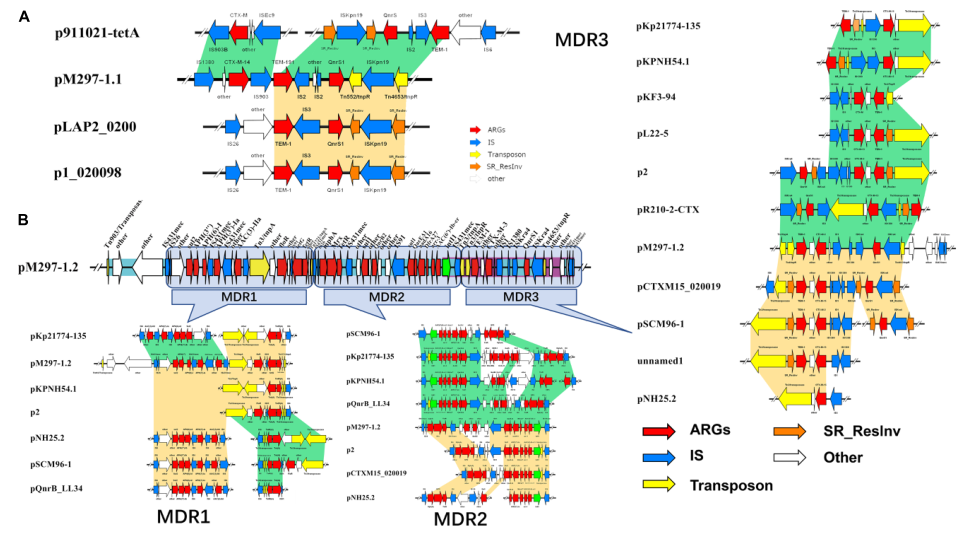 (A)pM297-1.1與其同源質(zhì)粒MDR區域特性及比較;(B)pM297-1.2與其同源質(zhì)粒MDR區域特性及比較。