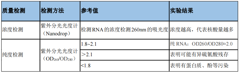 表1:通過(guò)紫外分光光度計檢測RNA的濃度和純度