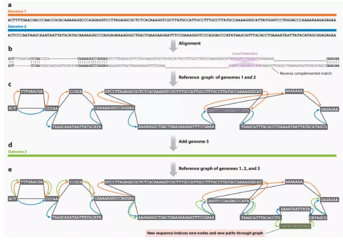 圖形泛基因組是指以參考基因組為框架,將其他個(gè)體材料基因組序列與之比對,存在差異的地方構成不同的分支,并隨著(zhù)新序列的加入不斷擴展變化,最終構建出一個(gè)包含全部變異信息的復雜圖形結構(圖11)。圖形泛基因組可以更好的展示每部分序列在泛基因組中的位置關(guān)系,使構建一個(gè)包含物種內全部遺傳信息的泛基因組成為可能。圖形泛基因組已經(jīng)在大豆、水稻、牛、高粱等物種有了初步構建與應用,為基因組學(xué)研究提供了一個(gè)重要的推動(dòng)力。