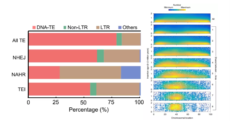 水稻中TEs,尤其是LTRs促進(jìn)非等位同源重組(Qin P et al.,Cell.2021);玉米泛基因組中隨著(zhù)個(gè)體的增加,LTR插入呈現向中心富集,并與插入時(shí)間的增加相關(guān)。