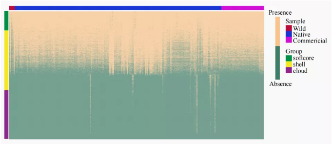 除此之外,根據core、dispensable等各組分聚類(lèi)結果構建基因家族的存在與缺失分布熱圖,進(jìn)一步了解不同材料中的差異情況。同時(shí)可結合不同來(lái)源or不同表型等特征充分挖掘其基因型的多態(tài)性。