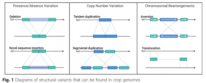 結構變異是泛基因組的重點(diǎn)研究對象,這些變異信息為物種的人為選擇及自然選擇提供原始的材料。了解變異產(chǎn)生的過(guò)程,探究不同材料的變異程度并利用有利的變異對維持并提高物種生產(chǎn)力至關(guān)重要,有助于解析物種表型和農藝性狀的多樣性。泛基因組研究,為更好地了解SV在動(dòng)植物馴化中的作用提供了基礎。主要研究的變異類(lèi)型為:SNP(Single nucleotide polymorphism),即單核苷酸多態(tài)性變異,主要指在基因組水平上由單個(gè)核苷酸的變異所引起的DNA序列多態(tài)性,這種變異可由單個(gè)堿基的轉換(transition)或顛換(transversion)所引起。InDel(Insertion-Deletion),指的是在基因組的某個(gè)位置上所發(fā)生的小片段序列的插入或者刪除,其長(cháng)度通常在在 2 bp-50 bp 之間。SV(Structure Variantions),即基因組結構性變異,通常指的是基因組上大長(cháng)度的序列變化和位置關(guān)系變化,有豐富的變異類(lèi)型,包括長(cháng)度在50bp以上的長(cháng)片段染色體倒位、染色體易位、重復、存在/缺失(PAV)、拷貝數變異(CNV)。