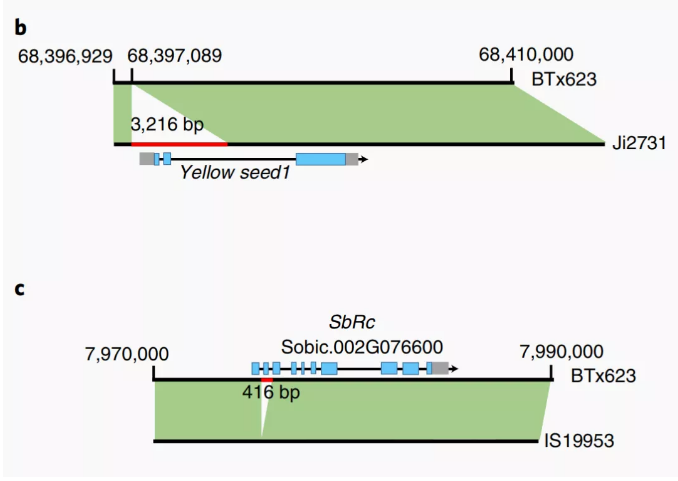 例如高粱泛基因組研究發(fā)現,相對于參考基因組,其它高粱個(gè)體基因組中有429~1118個(gè)基因存在拷貝數變異(CNV)。功能注釋顯示這些CNV基因豐富了防御反應、信號轉導和細胞蛋白分解代謝等生物學(xué)過(guò)程。并且不同高粱個(gè)體基因組上存在大量的存在缺失變異(PAV),有2514個(gè)基因受PAV嚴重影響,這些基因富集于與生物和非生物脅迫相關(guān)的生物過(guò)程,而抗病基因在這組基因中顯著(zhù)富集。進(jìn)一步研究發(fā)現Yellow seed1、SbRc的PAV影響到高粱籽粒顏色變化(圖9)