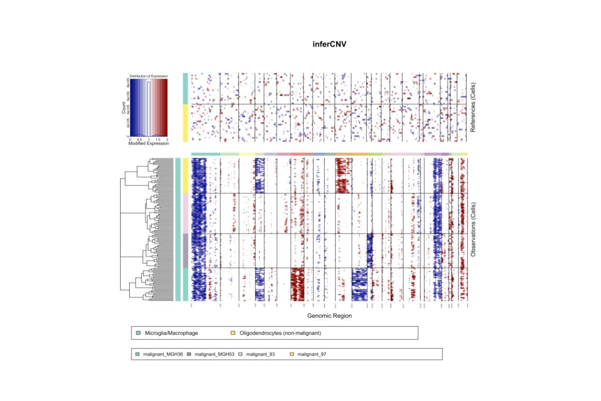 2014年發(fā)表在science(IF=47.728)上的《Single-cell RNA-seq highlights intratumoral heterogeneity in primary glioblastoma》[1],通過(guò)對基因相對表達水平來(lái)推斷每個(gè)細胞的大規??截悢底儺悾–NV)。該研究選擇正常人的腦組織bulk RNA-seq的數據作為對照,單細胞樣本聚為7組,無(wú)監督分析確定了9個(gè)異常細胞,它們具有成熟少突膠質(zhì)細胞基因表達增加和膠質(zhì)母細胞瘤基因下調的特點(diǎn),剩余的420個(gè)細胞中沒(méi)有一個(gè)顯示出與非惡性細胞或免疫細胞類(lèi)型的轉錄程序相似的特征。雖然非惡性細胞是腫瘤微環(huán)境的關(guān)鍵組成部分,但該研究通過(guò)解離和CD45+分選后,已經(jīng)很大程度上排除了非腫瘤細胞。該研究通過(guò)infer CNV有效地將腦膠質(zhì)母細胞瘤中的正常細胞與惡性細胞區分開(kāi)來(lái)。
