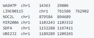 (3) 基因或染色體位置文件:提供每個(gè)基因的染色體位置。文件共4列,分別是基因名稱(chēng)、染色體和基因跨度,文件以制表符分隔。
