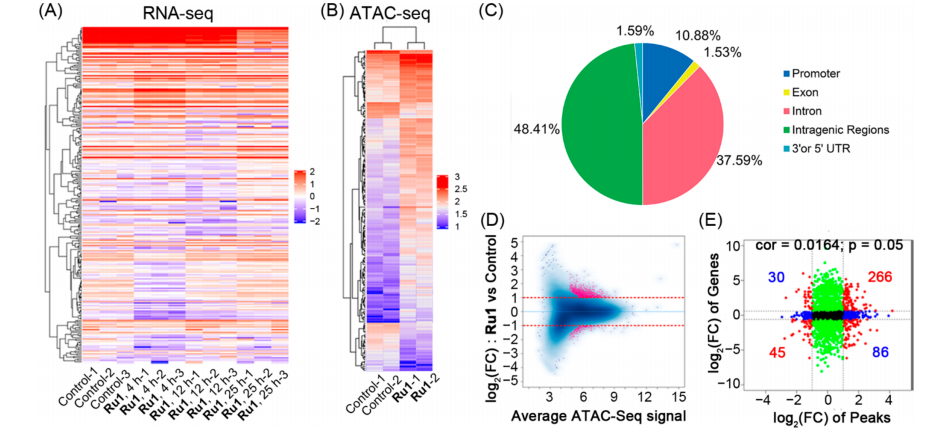 DNA的相分離參與染色質(zhì)的包裝來(lái)調節基因的轉錄?;罴毎蠨NA相分離的可視化和操作面臨著(zhù)巨大的挑戰。本文作者提出了一種Ru(II)復合物(Ru1),該復合物具有較高的DNA結合親和力和DNA“光開(kāi)關(guān)”行為,可以誘導和監測體外活細胞中的DNA相分離。分子動(dòng)力學(xué)模擬表明,Ru1中兩個(gè)帶有正電荷親脂三苯基膦取代基和柔性長(cháng)烷基鏈的phen-PPh3配體在DNA分子間形成多價(jià)結合力誘導DNA相分離中發(fā)揮了重要作用。重要的是,Ru1獨特的環(huán)境敏感發(fā)射特性可以通過(guò)雙光子磷光壽命成像直接可視化活細胞中DNA相分離的動(dòng)態(tài)過(guò)程。此外,通過(guò)RNA測序和ATAC測序相結合的結果發(fā)現Ru1可以通過(guò)調節染色質(zhì)可及性來(lái)改變基因的表達模式??傊?,作者在這里提出了第一個(gè)基于小分子的活細胞DNA相分離的示蹤劑和調節劑,并闡明了其對染色質(zhì)狀態(tài)和轉錄組的影響。